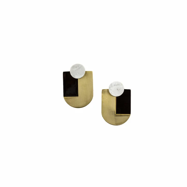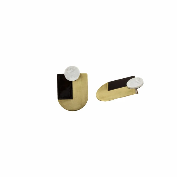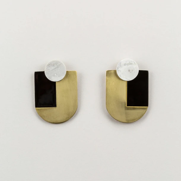 Boucles d’oreilles en laiton, pierre et laque noire qui s’inspirent du métissage architectural au Vietnam durant la période art déco.