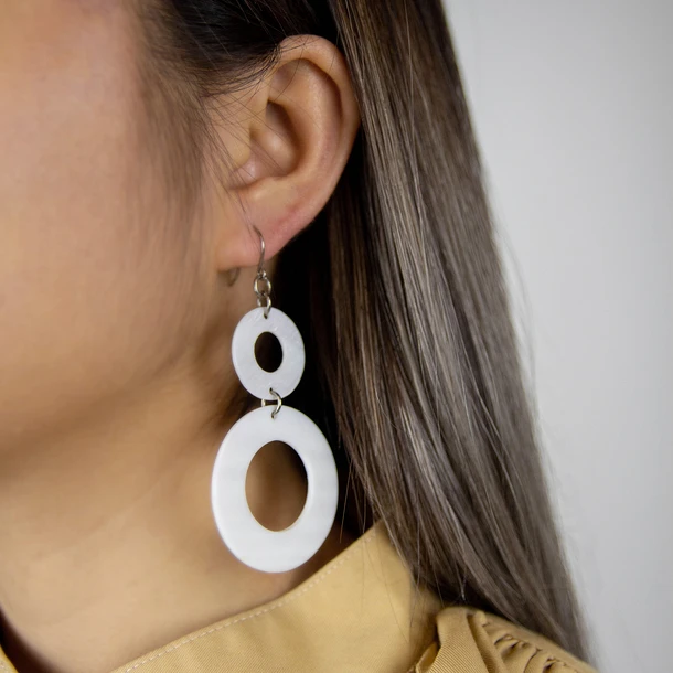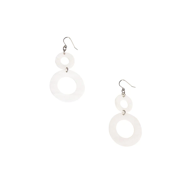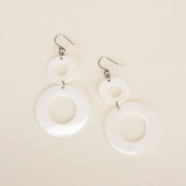 D’élégantes boucles d’oreilles en forme de double-disques percés en nacre blanche.