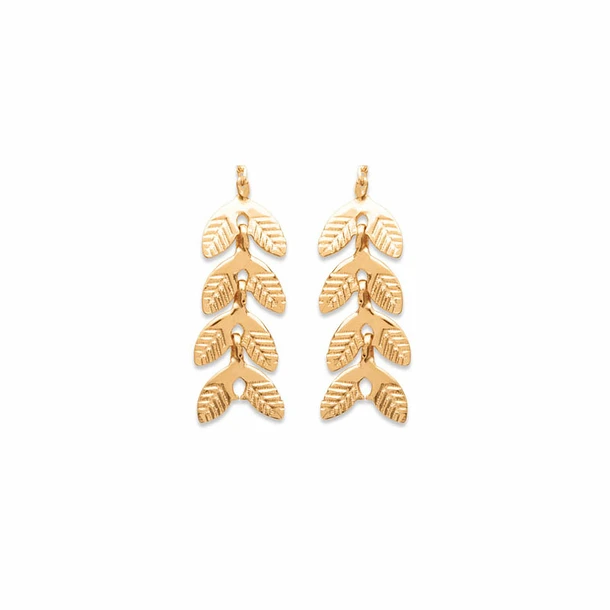 Ces boucles d’oreilles en laiton plaquĂ© or au design Ă©lĂ©gant et minimaliste reprennent un motif dĂ©coratif avec des feuilles de laurier.
