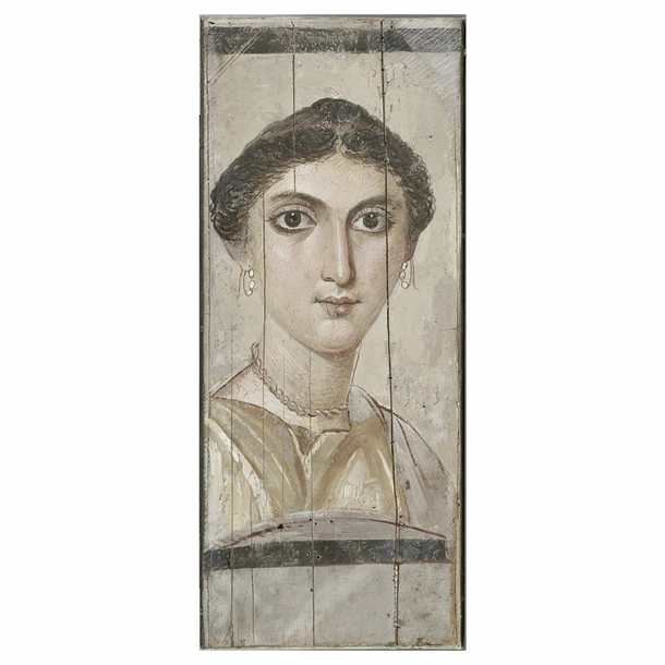La défaite d’Actium en 31 av. J.-C. marque le passage de l’Égypte de la domination ptolémaïque à celle de Rome. Si les conquérants adoptent rapidement les coutumes funéraires locales, ils y apportent une nouveauté : le portrait appliqué sur la momie. Les portraits découverts dans la région du Fayoum témoignent de cette étonnante cohabitation entre les pratiques funéraires égyptiennes, le monde romain, et l’influence hellénistique toujours marquée. Peints essentiellement sur panneaux de bois ou sur toile de lin, à la cire ou à la détrempe, ces portraits permettent d’identifier le défunt, et indiquent son sexe, son âge, et son statut social. Les bijoux peuvent constituer des critères de datation, certains modèles étant influencés par la mode contemporaine tandis que d’autres restent plus intemporels. Les boucles d’oreille portées par cette jeune femme sont faites de trois perles blanches enfilées sur un fil d’or qui forme un anneau, et dont l’extrémité redescend derrière le lobe. Quant à son collier, il s’agit d’une torsade d’or au ras du cou.