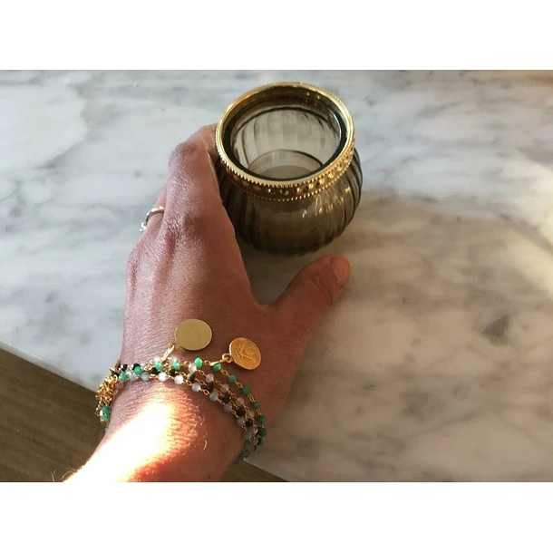 Bracelet en laiton doré à l’or fin et perles de verre facetées avec un médaillon sur lequel figure une abeille, emblème napoléonien, symbole d’immortalité et de résurrection.