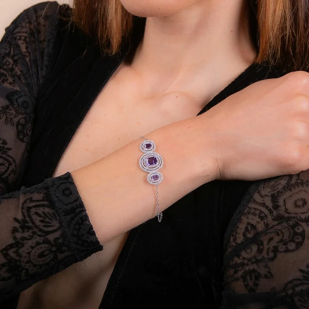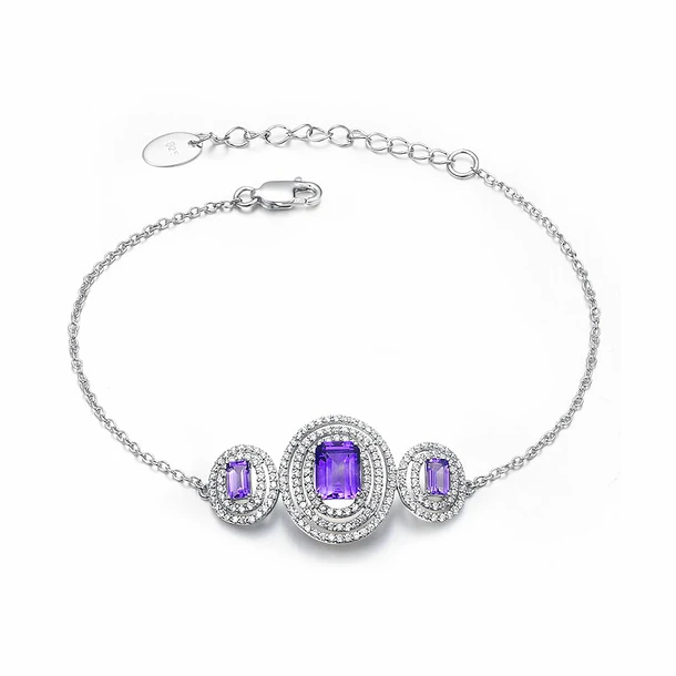 Bracelet d’améthyste composé de pierres précieuses brésiliennes de taille émeraude serties à la main en argent sterling 925 plaqué rhodium.