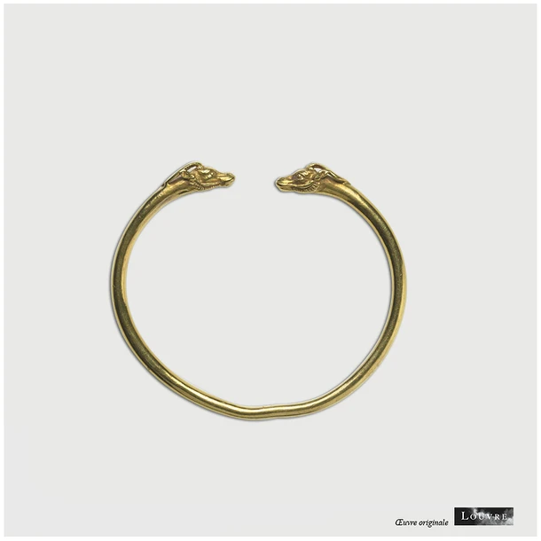 A l’époque hellénistique, on trouve, dans le monde grec, de nombreux bracelets de ce type, dont les extrémités sont ornées de têtes zoomorphes. Les espèces représentées sont variées : lions, béliers, chèvres, veaux, lynx ou griffons. Cet exemplaire, trouvé en Syrie, s’apparente aux productions achéménides.
