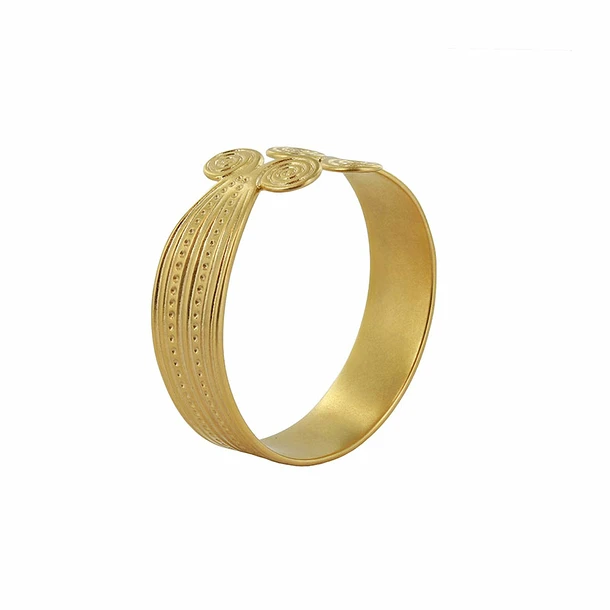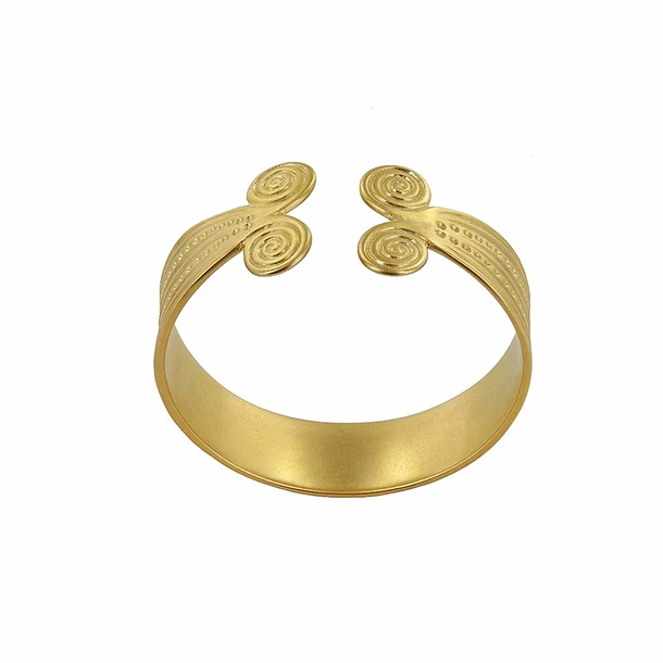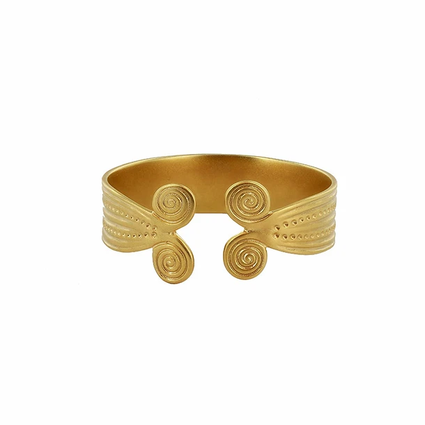 Ce bracelet en plaqué or s’inspire du bracelet de Rongères (Rongères Bronze moyen XIIIè – XIIè s. av. J.-C. – Or / Musée d’Archéologie nationale, Domaine National, Saint-Germain-en-Laye)