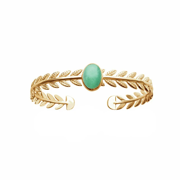 Ce bracelet en laiton plaqué or au design élégant et minimaliste reprend un motif décoratif avec des feuilles de laurier.