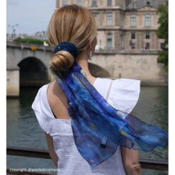 Ce carré 100 % soie est l’accessoire indispensable à utiliser de toutes les manières : à nouer autour du cou, des cheveux ou bien à porter en ceinture.