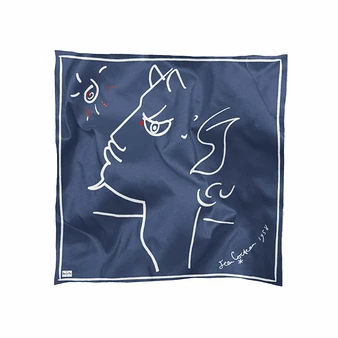 Ce carré en mousseline 100% soie reprend un dessin de Jean Cocteau (1889-1963) réalisé en 1958, Tête de Faune.