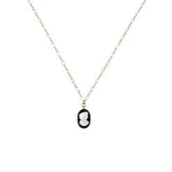 Le médaillon de ce collier en laiton doré, agate et nacre est inspiré d’une broche-médaillon ovale du XIXe siècle.
