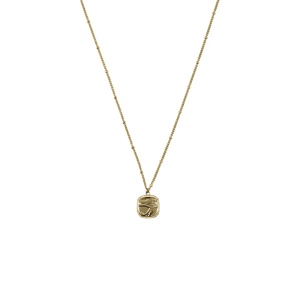 Ce pendentif en acier inoxydable reprend le motif d’un Œil oudjat, figure classique de l’Égypte antique.