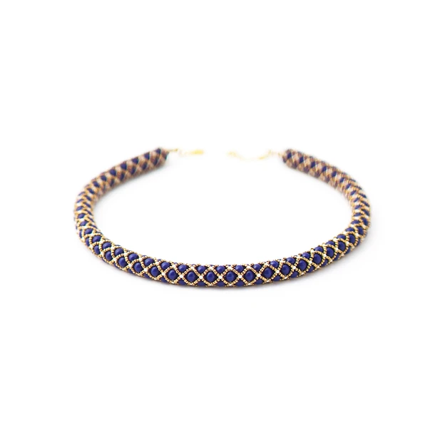 Votre collier en perles de verre bleu lapis a été fabriqué à la main dans notre atelier en France près de Paris par un artisan créateur. D’inspiration historique, il évoque les anciens travaux de passementerie de la fin du moyen âge et du début de la Renaissance. Ses couleurs semi-précieuses et ses finitions en argent ou en vermeil (argent plaqué or) offrent à ce bijoux fantaisie le statut de la joaillerie et de la haute couture.