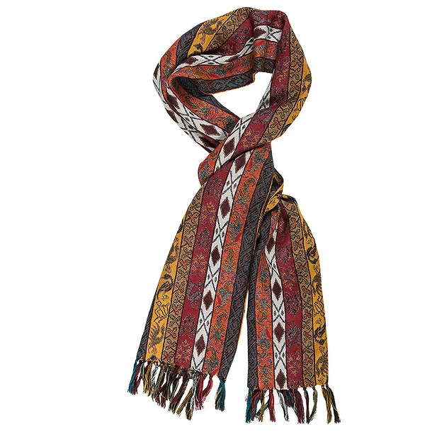 Cette pièce chatoyante est un lampas de soie à décor de rayures verticales portant des motifs alternativement colorés. Dessins géométriques floraux et animaliers se développent sur le tissage en un rythme très subtil et d’une grande modernité.