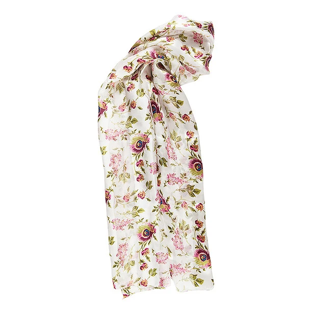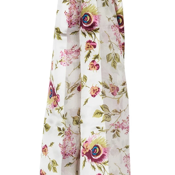 Cette étole, « Grand Broché » de la Reine, s’inspire d’un lampas broché à fond blanc, à grand décor de fleurs, rubans et plumes de paons ; il ornait la chambre de Marie-Antoinette à Versailles.
