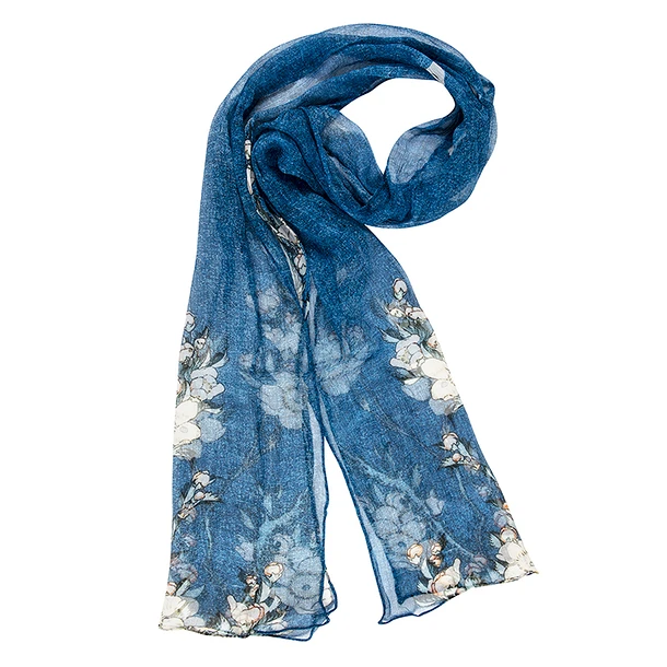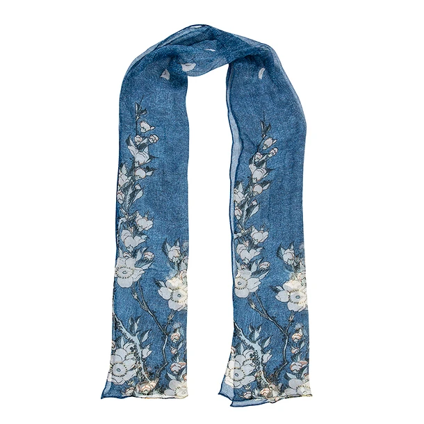 Cette étole s’inspire d’un détail d’une œuvre de la série des Petites fleurs de l’artiste japonais Katsushika Hokusai (1760-1849), « Bouvreuil et cerisier-pleureur », 1834.