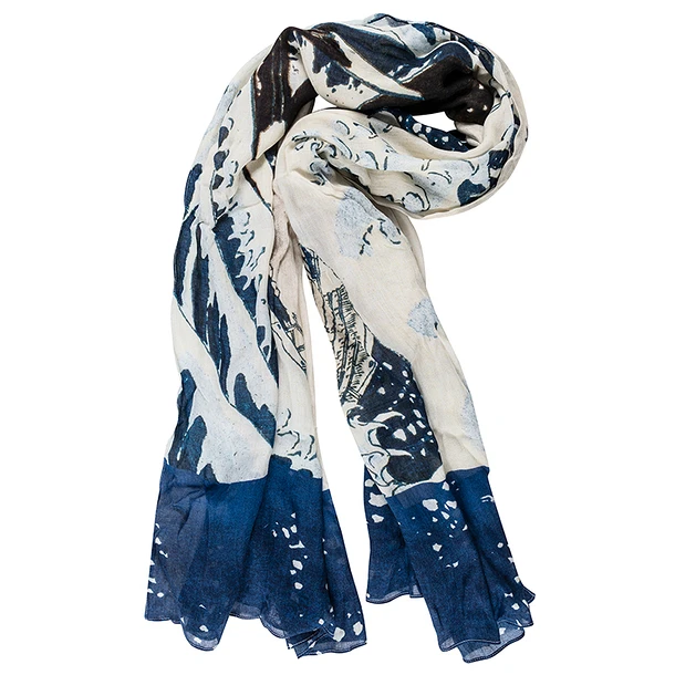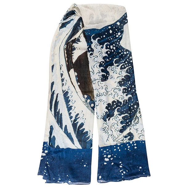 Cette étole grand format s’inspire d’un détail d’une des œuvres les plus célèbres de l’artiste japonais Katsushika Hokusai (1760-1849), « Sous la vague au large de Kanagawa » (« la grande vague ») (Kanagawa oki namiura) 1830-32.
