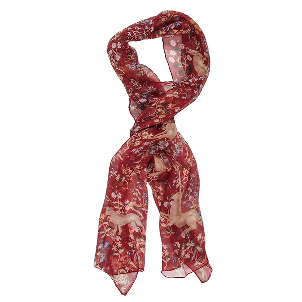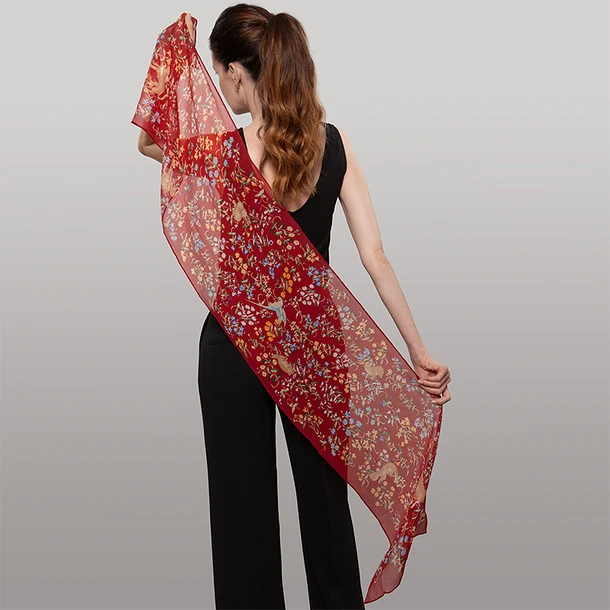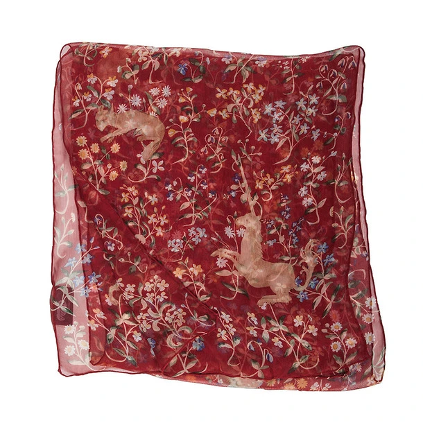 Un splendide fond rouge vermeil compose le décor de chacune des tapisseries de La Dame à la licorne. Cette célèbre tenture, commandée par Jean Le Viste, membre d’une riche famille lyonnaise, constitue l’un des chefs-d’œuvre lissier du musée. Les six tapisseries illustrent, à travers des jeunes femmes somptueusement parées, les cinq sens. Les scènes se détachent sur des jonchées de millefleurs coupées, comme des bouquets lancés sur le sol devant les processions ou dans les demeures nobles. Présentées comme un herbier, ces simples fleurs, où l’on reconnaît la menthe, la pâquerette, la violette ou l’œillet et la pervenche, évoquent les jardins domestiques ou courtois de la fin du Moyen Âge.
