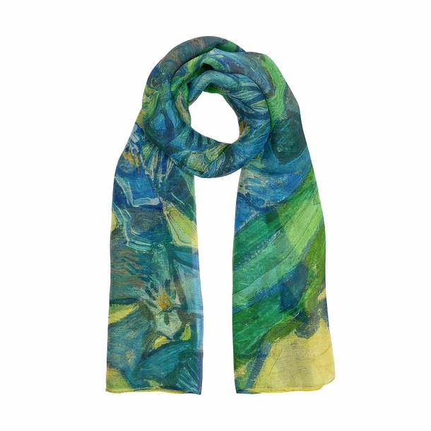 Illuminez votre look avec cette élégante écharpe imprimée d’un détail de l’un des tableaux les plus célèbres de Vincent van Gogh (1853 – 1890), les Iris (Huile sur toile, 92.7 cm x 73.9 cm).