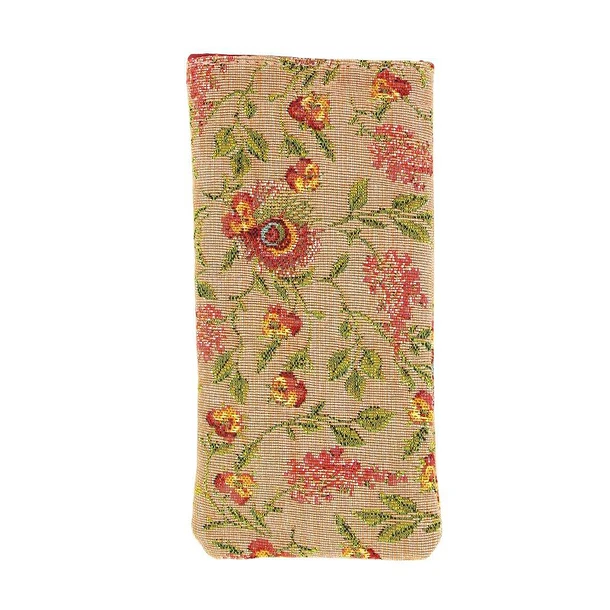 Cet étui s’inspire d’un lampas broché à fond blanc, à grand décor de fleurs, rubans et plumes de paons ; il ornait la chambre de Marie-Antoinette à Versailles.