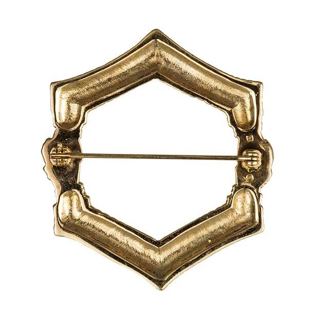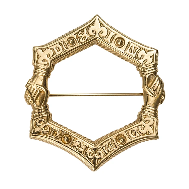 Les fermails servaient Ă attacher les pans d’un vĂŞtement d’apparat. Ce modèle hexagonal avec des mains croisĂ©es et une inscription est une rĂ©plique d’un chef-d’Ĺ“uvre du Moyen-âge.