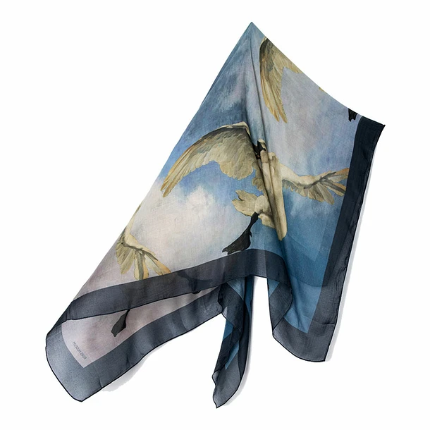 Ce foulard en soie créé par Hellen van Berkel pour le Rijks Museum est inspiré de l’œuvre du peintre Jan Asselijn (1610-1652), « Le cygne menacé », vers 1650.