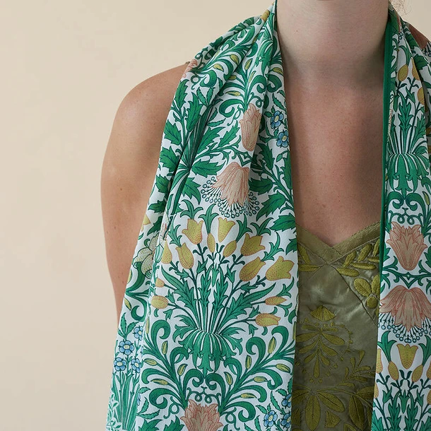 Inspirés par l’approche très originale et très britannique des motifs de William Morris, nous avons créé une luxueuse écharpe en soie de chine ornée du motif Garden de William Morris. Délicat et flottant, vous pouvez pratiquement sentir les fleurs !