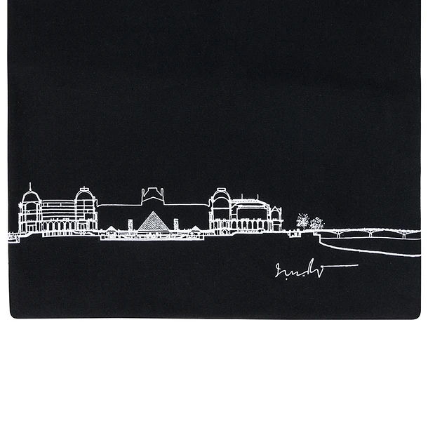 Le motif de ce sac reprend un plan en coupe longitudinale du projet de Pyramide de l’architecte Ieoh Ming Pei pour le Louvre.